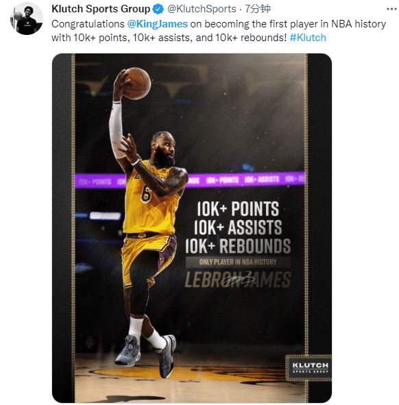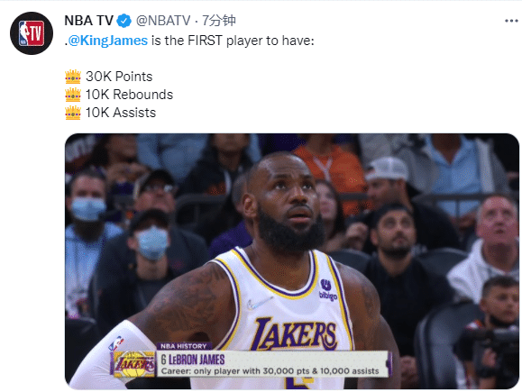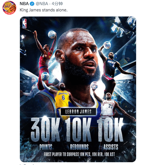 在湖人和太阳比赛中,詹姆斯正式达到36000分+10000助攻+10000篮板的历史第一伟大神迹,成为NBA 75年历史第一位30000+10000+10000的球员,詹姆斯创纪录瞬间引热议,众美媒纷纷晒图祝贺,湖人官方盛赞:国王,历史第一且唯一一人。
