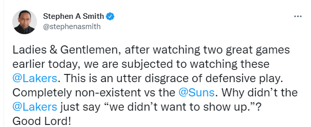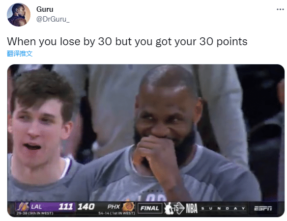 湖人记者Ryan Ward发推写道:勒布朗在被太阳队压垮后尴尬地露出满脸笑容,这总结了湖人的这个赛季;有球迷说当湖人输将近30分而詹姆斯拿到30分时,他笑了。