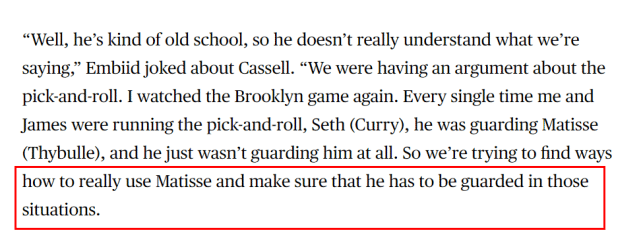“嗯,他有点老派,不大明白我们在说什么,”恩比德拿卡塞尔开起了玩笑,“我们在挡拆方面发生了一些争执。我又看了对篮网的比赛录像,每一次我和哈登在进行挡拆时,原本防守马蒂斯(塞布尔)的塞斯(库里),都没去防守他。所以我们在努力寻找如何真正使用塞布尔的方法,确保他会吸引对方的防守。”