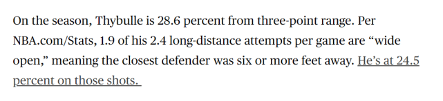 赛季至今,塞布尔的三分命中率是28.6%,他场均2.4次三分出手里有1.9次是大空位(最近防守者在6英尺以外),而这种大空位三分,塞布尔的命中率只有24.5%。他成为76人队中的“威少”,三分线外常常被对手放掉。