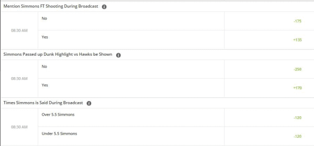 在比赛直播期间,是否会提到西蒙斯的罚球?否-175,是+135。赔率倾向于不会提及。