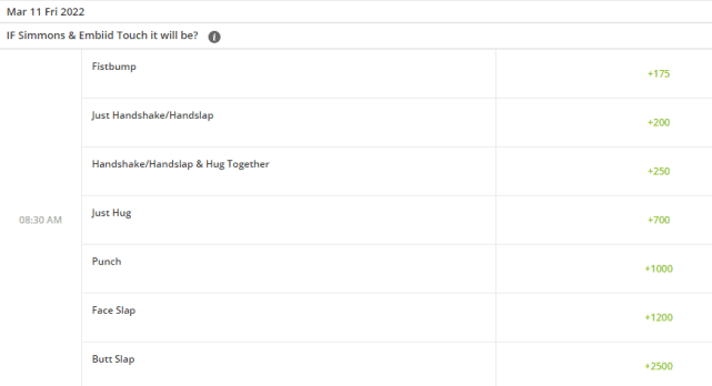 如果西蒙斯和恩比德有互动,会是怎样的互动呢?赔率显示,击拳的赔率是+175,握手和击掌的赔率是+200,握手击掌并拥抱的赔率是+250,只是拥抱赔率是+700,挥拳的赔率是+1000,扇耳光的赔率是+1200,打屁股的赔率是+2500。
