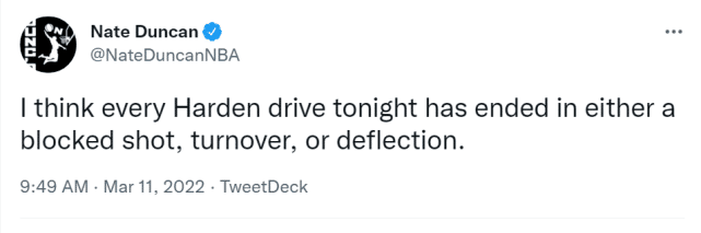 来源:JRS直播网03-11 15:14JRS直播网03月11日讯 ,哈登今天的表现也引起大量吐槽。有美记表示,哈登今天的突破要么被封盖,要么失误,要么就是被对方干扰掉了。事实也的确如此,哈登全场的3个运动战进球都是三分球,他的两分球10投0中,被对方帽了6个。