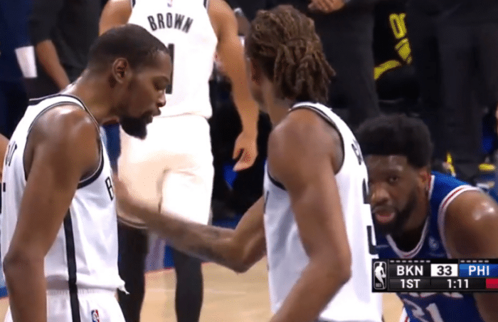 来到比赛末段,恩比德继续疯狂造犯规罚球。在又一次造犯规之后,恩比德嘴里碎碎念,杜兰特此时也非常不爽,上前和恩比德激烈交谈。直到裁判过来好言相劝,两人才得以分开。现场导播立刻给到了上一次两队交手时,杜兰特和恩比德互喷的画面,场面非常火爆。