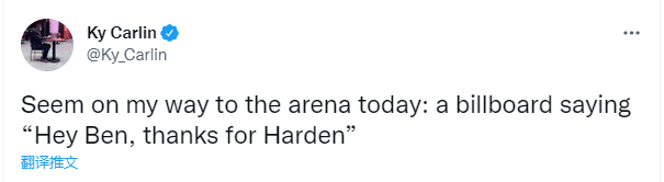 76人随队记者Ky Carlin赛前发推表示:“在我今天去富国银行中心球馆的路上,我似乎看到一块广告牌上写着‘嘿,本西,谢谢你换来了哈登。