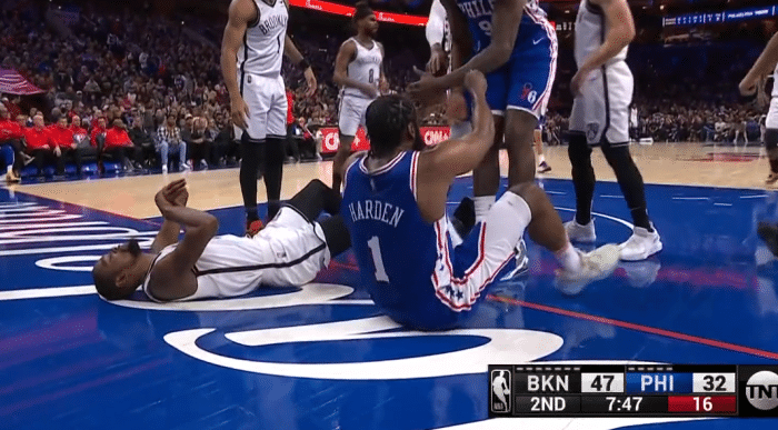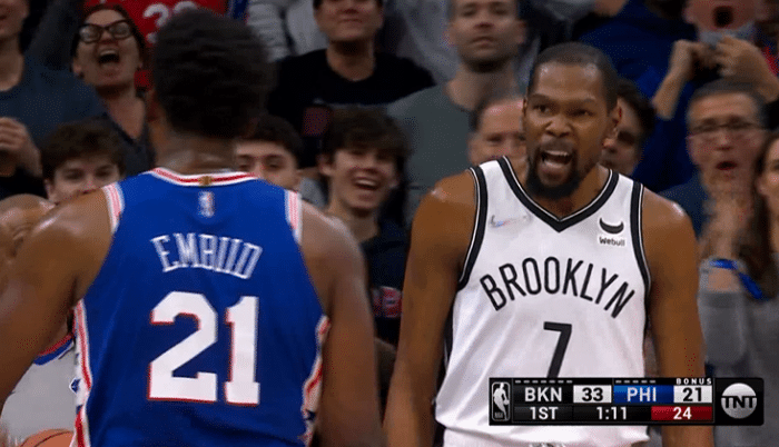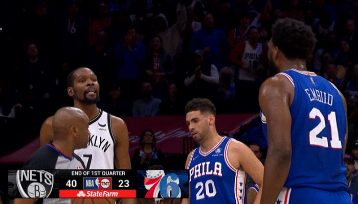 杜兰特被撞倒与哈登无交流,轰25+14!打爆76人与恩比德火爆互喷
