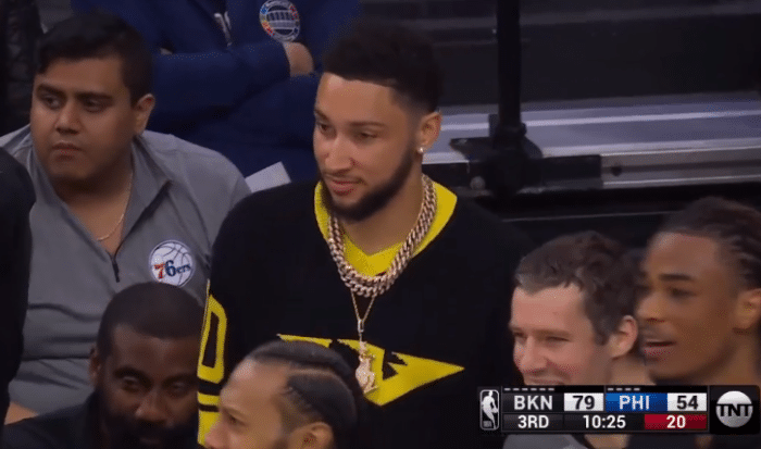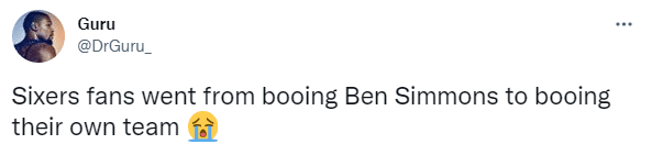 下半场,杜兰特外线追身三分一击即中,无解干拔回应恩比德,篮网火力依旧不可阻挡,76人喊暂停也没用,暂停回来连续失误,篮网反击继续扩大领先;篮网打爆76人,西蒙斯露出笑容,76人球迷则是从狂嘘西蒙斯改成狂嘘76人。