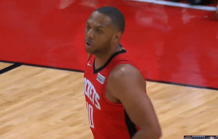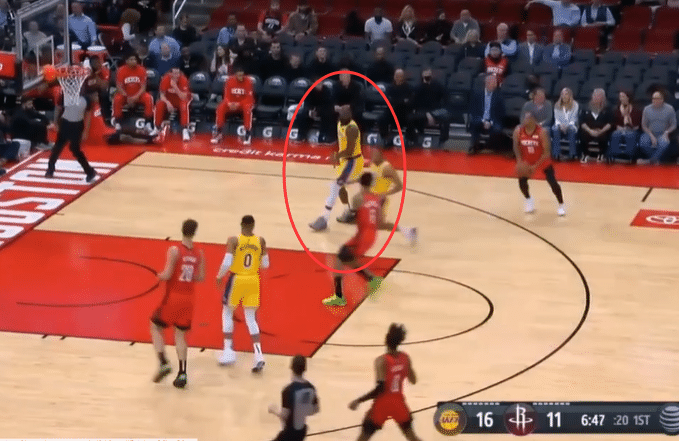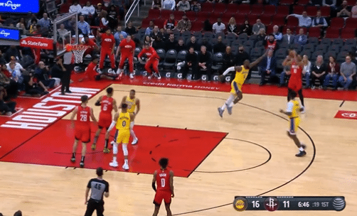 湖人开局防守不错,6-0开局,防守也相当积极。但很快,湖人方面的防守开始出问题,火箭多点开花连续得分。在一次蒙克三分不中之后,火箭形成转换反击。戈登在右侧45度持球,詹姆斯在戈登身前,负责防守。
