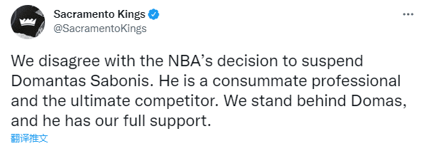 国王官方回应NBA禁赛处罚:我们不同意联盟禁赛多曼塔斯-萨博尼斯的决定。他是一位非常具备职业精神和竞争精神的球员,我们全力支持萨博尼斯!