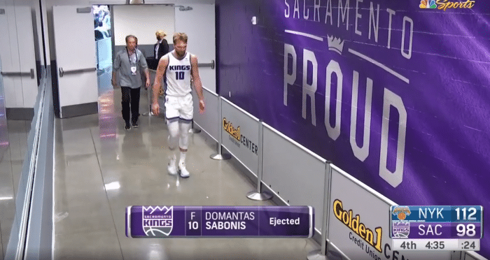 此前在国王与尼克斯比赛第四节4分35秒,小萨博尼斯挥拳不满吹罚而吃到技术犯规,之后小萨情绪失控,和裁判发生身体接触而被驱逐离场;这是小萨职业生涯首次被驱逐,离场时小萨十分生气,疑似骂骂咧咧走回更衣室。