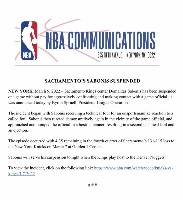 NBA官宣罚单!小萨因和裁判肢体接触被禁赛一场,国王官方声明反对罚单