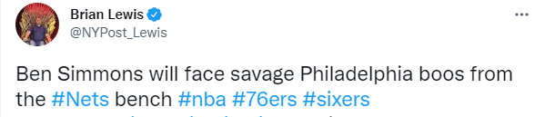 西蒙斯确定随队前往费城,不会参加比赛但会坐在替补席观战,纳什亲口确认,并且表示西蒙斯想和队友们在一起,纽约记者Brian lewis表示西蒙斯将遭遇费城球迷的狂嘘。