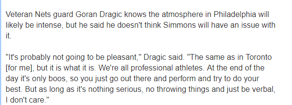 德拉季奇知道届时费城的气氛可能会很紧张,但他说他不认为西蒙斯会有什么问题。