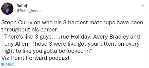 当被问到职业生涯至今遇到过最难缠的3位防守者时,库里表示:“应该是这3个家伙,朱-霍勒迪、艾弗里-布拉德利和托尼-阿伦;这三个人每天晚上都会引起你的注意,并且将你锁定。