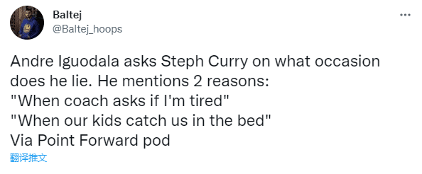 当被问道什么情况下会撒谎的时候,库里列出了以下两点情况——第一、当教练问我累不累的时候;第二、当我们(库里和阿耶莎)在床上被孩子抓到的时候。