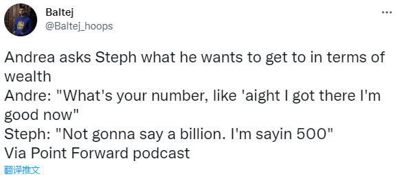 谈到自己的财富目标,伊戈达拉问库里想要多少财富:你的数字是多少,比如现在就好了;库里表示:不会说10亿(美元),我会说5000亿(美元)。