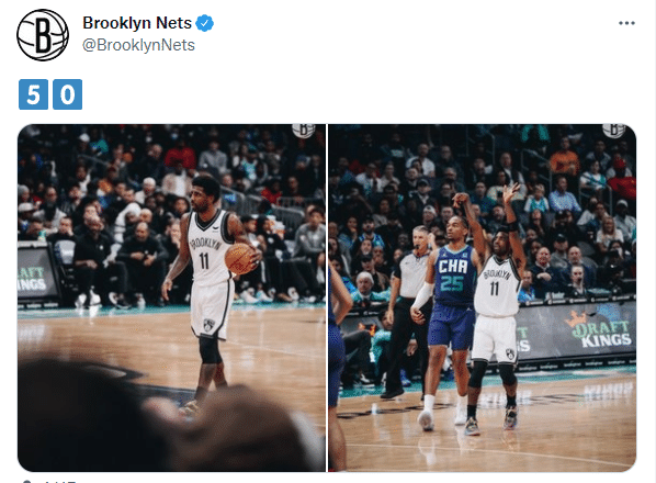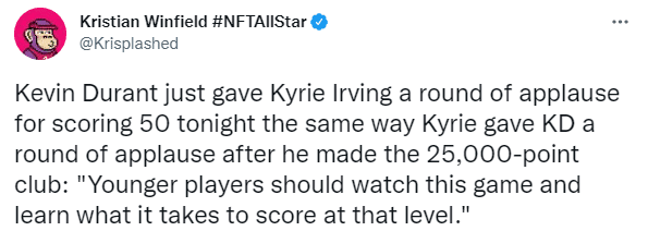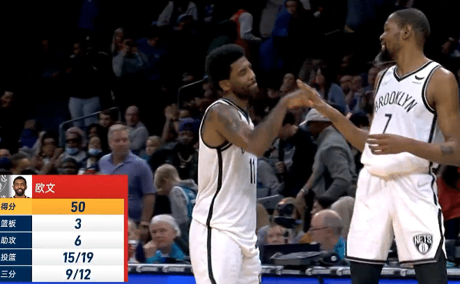 本场比赛,欧文第一节拿到12分,第二节8分,第三节14分和末节16分,全场投进9记三分轰下50分;末节比赛还剩40秒,欧文提前下场,单手指天庆祝之后,欧文与杜兰特花式击掌庆祝,杜兰特满脸笑容;今日一战,杜兰特13投6中拿到14分7助攻3篮板。