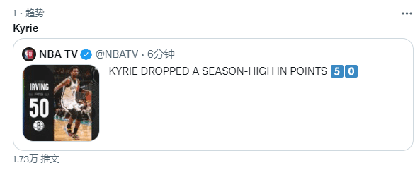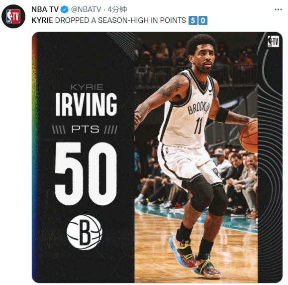 篮网客场132-121击败黄蜂,欧文大爆发,超神一战19投15中、三分12中9轰下50分6助攻3篮板1盖帽1抢断,统治全场拒绝34分大逆转,欧文一战狂刷多项历史纪录,欧文冲上推特热搜榜第一名,引发全美热议,众美媒狂吹膜拜。