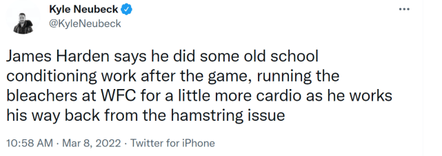 哈登告诉记者,他进行了一些老派的体能训练,为了从腿筋伤势中更好的回归,他进行了爬楼梯训练。不得不说,加入76人后,哈登的表现积极多了,不只是在球场上,而且在球场外也更加努力。之前,哈登曾表示自己愿为76人夺冠付出一切,他不是说说而已,而是付诸行动。