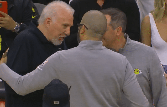 末节比赛两队比分来到97平,湖人连续失误,穆雷连拿4分,珀尔特尔勾手命中,蒙克失误,理查德森追身三分命中,马取取得了9分的领先优势,湖人暂停,暂停回来湖人一波6:0的小高潮打停马刺,穆雷跳投命中,威少造犯规两罚一中,珀尔特尔造犯规两罚全中,马刺保持着5分左右的领先优势,蒙克突破上篮,湖人将分差缩小到了4分,珀尔特尔关键四罚三中,蒙克三分不中,马刺117:110战胜了湖人,本场比赛威少14中5得到了17分,蒙兢17分。马刺这边穆雷26分10篮板8助攻。波波维奇迎执教常规赛第1335胜,追平老尼尔森升至历史第一,赛后沃格尔与波波老爷子相拥,送上了祝福。