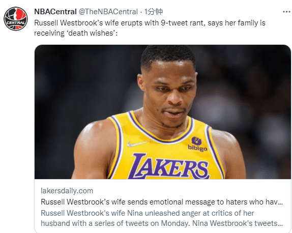 来源:JRS直播网03-08 19:28JRS直播网03月08日讯 湖人球星威少的妻子妮娜(Nina Westbrook)连续更新9条推文,自曝他自己及家人受到球迷的语言猥亵及死亡威胁,希望其他的优秀球员不要被羞辱和谩骂。