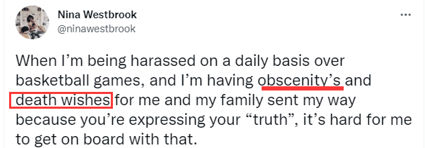 威少爱妻妮娜发推:我现在几乎每天都因为篮球比赛而被骚扰,他们对我和我的家人进行语言猥亵及死亡威胁,他们在表达他们所谓的‘真理’,我真的很难接受这一点。
