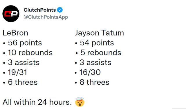 此前,詹姆斯曾在节目中表示,外界谈论有史以来最好的得分手时,从来没有提到他的名字,让他气炸了。事实证明,他确实是史上最好的得分手之一,就在昨天,37岁的詹姆斯才刚刚轰下56分!