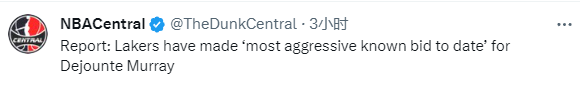 名记Jake Fischer表示,湖人对老鹰球员德章泰-默里提出了迄今为止最激进的报价,即包括一个2029年首轮选秀权和一个选秀权互换。但老鹰正在寻找比拉塞尔更好的球员回报,且似乎不愿意接手大合同,有可能在交易截止日前进行另一笔包括拉塞尔在内的三方大交易。