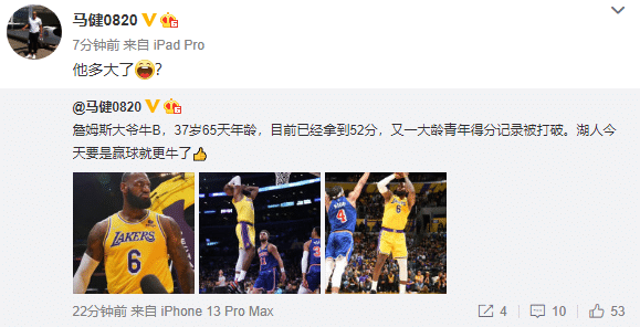 比赛期间,詹姆斯的前湖人队友库兹马也在社交媒体上关注着比赛进程,末节当詹姆斯疯狂表演的时候,库兹马发文盛赞詹姆斯,称勒布朗就是大师级的。