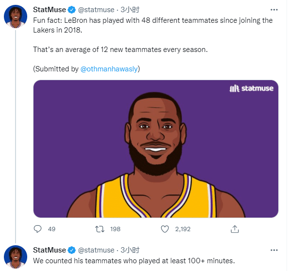 据美媒StatMuse统计,自2018年詹姆斯加盟湖人后,他已经与48位不同的队友搭档过,至少打过100分钟,也就是说平均每个赛季,詹姆斯会有12位新队友;美媒如此数据引热议,有多名球迷直言:他是球队总经理(LeGM)。