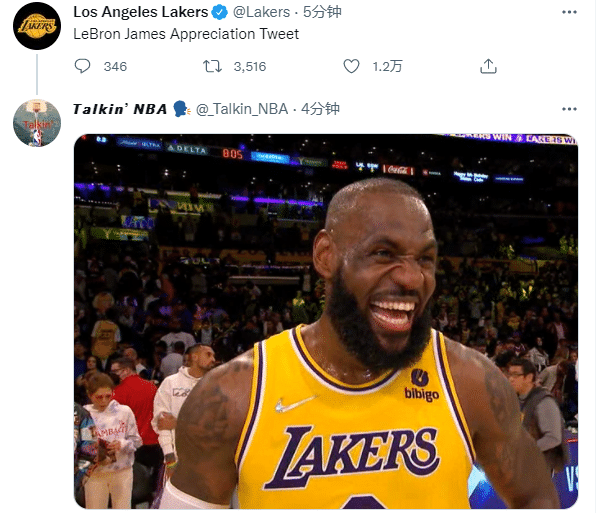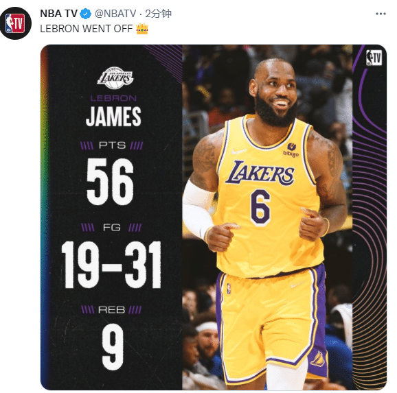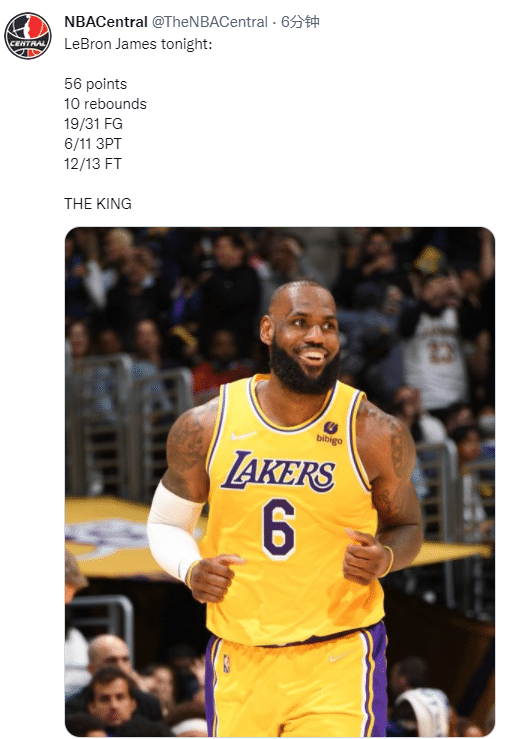 NBA central晒出詹姆斯本场比赛的数据,并且直呼:国王(The King);湖人官方发推写到勒布朗-詹姆斯该感激推文,美媒晒出赛后詹姆斯咧嘴大笑的画面,无数球迷不离场,而且高呼MVP。
