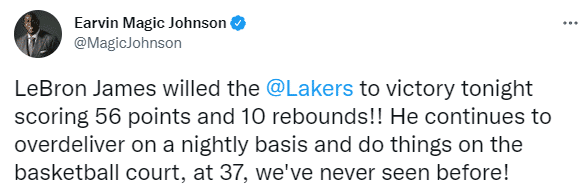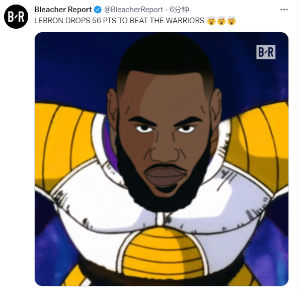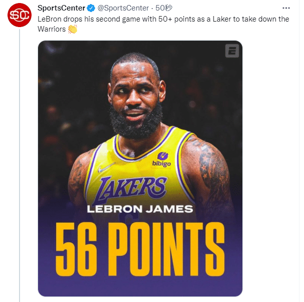 美媒露天看台、SportsCenter都发推狂赞詹姆斯轰下56分带队击败勇士;湖人名宿魔术师约翰逊发推写到:詹姆斯轰下56分10篮板带队取得胜利,37岁打出这样的表现,这是我们从未见过的。