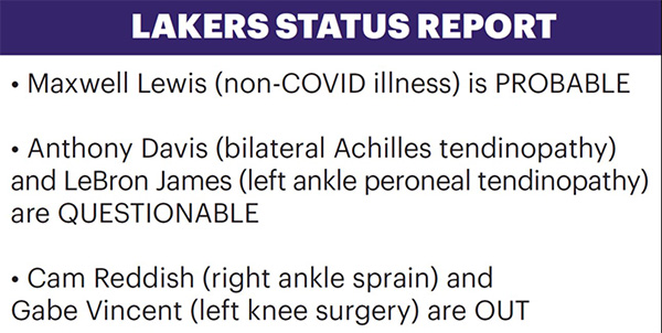 目前,湖人伤病名单上有5名球员,詹姆斯和浓眉两大巨头在列,根据之前的情况,预计詹眉都会出战勇士;雷迪什因脚踝伤势将缺席两周,之后接受队医的重新评估,雷迪什复出后仅仅只打了2场比赛又伤了。