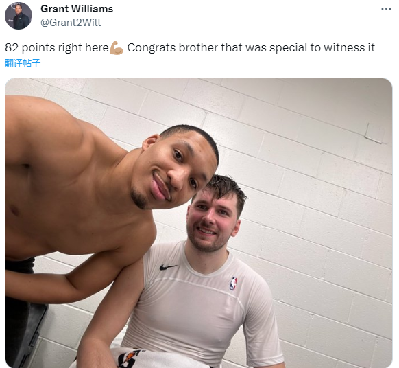 赛后,格威晒与东契奇合影,配文写道:82分就在这合影中,恭喜兄弟,能见证这一切很特别。