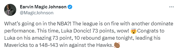 湖人名宿魔术师发推写道:NBA到底怎么了?联盟又一次有人打出统治级别的表现。这次是东契奇!哇,恭喜他今天打出了73分10篮板的惊人表现,带领他的独行侠以148-143战胜了老鹰。