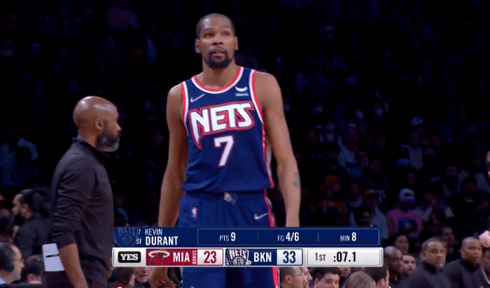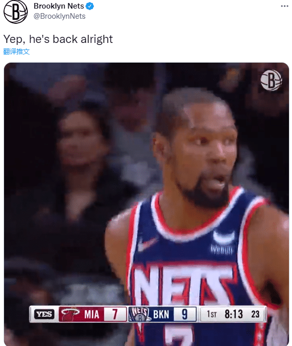 篮网首节35-23领先12分。篮网主场对阵热火,杜兰特正式复出,时隔47天连续休战21场,死神终于回来了,首节上场8分钟6投4中、三分2中0拿到9分1盖帽1篮板,连续命中4个中投宣布王者归来,死神归位,篮网瞬间变得不一样了。