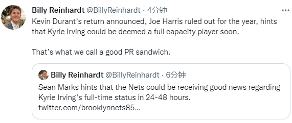该记者还表示:杜兰特归来,乔-哈里斯赛季报销,暗示欧文可能很快就会成为一名全职球员。