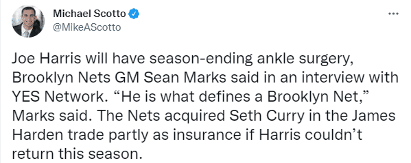 篮网总经理肖恩-马克斯发表声明,表示哈里斯尝试了所有的努力,无奈最终仍需要接受手术,他将错过本赛季剩余的全部比赛;与此同时,篮网总经理还透露一大利好消息。