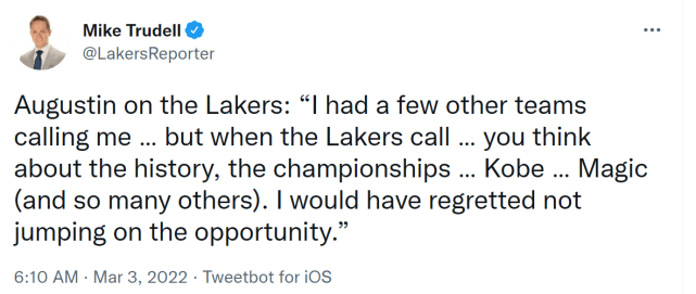奥古斯丁的前队友是威少,他俩曾在雷霆一起打过球。“被火箭裁掉后,我接到了好几支球队打来的电话,但我当时的心思不在那上面。我最近就是在家陪陪孩子,然后进行一些个人训练,”奥古斯丁说道,“经纪人来电话告诉湖人想要我时,我正在休斯顿接孩子。湖人的历史、总冠军、科比、魔术师,还有许多其他巨星……我觉得如果我错过了这个机会,未来一定会后悔。”