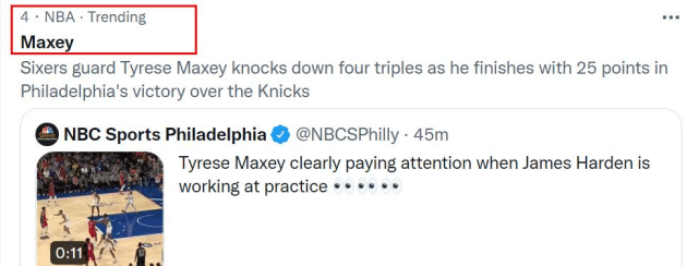 来源:JRS直播网03-03 20:25JRS直播网3月03日讯 ,76人123-108击败尼克斯,完成16分大逆转。马克西得到25分4篮板3助攻,连续3场比赛得分20+,这也追平了他个人生涯连续20+的场数纪录。上下半场,马克西的表现判若两人,上半场,他只得到4分,而下半场,马克西得到21分,第三节11分,第四节10分。赛后,他第一时间冲上全美热搜,热度甚至高于哈登和恩比德!