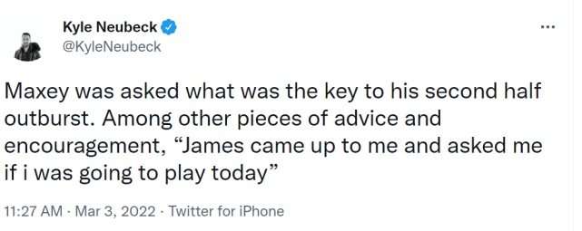 赛后接受采访时,马克西谈到了自己下半场爆发的原因,原来和哈登有关。“詹姆斯(哈登)走到我面前,问我今天还想不想打球!”正是哈登的这句话,激发了马克西的斗志,他在下半场迎来大爆发。后两节7投5中,三分5投4中,罚球8罚7中,得到21分!