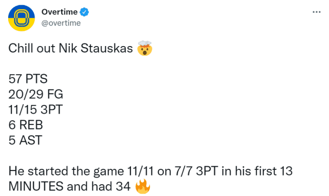 美媒报道称,斯陶斯卡斯本场比赛的表现相当炸裂!他在前13分钟就轰下34分,而且前11次出手全部命中,包括三分球7投7中!缺少射手的球队,确实可以考虑一下这位昔日的8号秀!