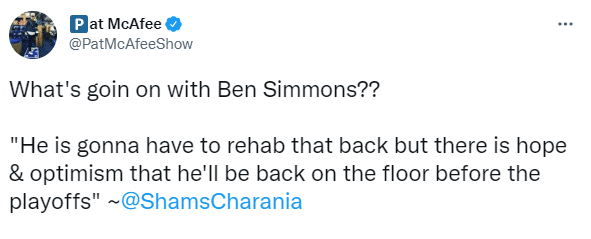 来源:JRS直播网03-01 15:30JRS直播网03月01日讯 篮网新巨头西蒙斯何时能够复出?shams表示西蒙斯将会养伤,但乐观的是他将在季后赛前重返赛场。