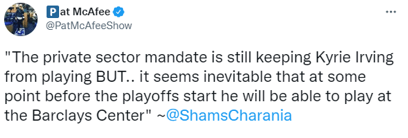 shams表示:私营部门仍在阻止凯里-欧文参加主场比赛,但是在季后赛开始前的某个时刻,他将不可避免地能够在巴克莱中心球馆打比赛。