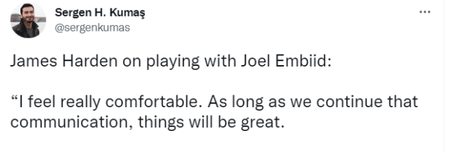 赛后,恩比德谈到搭档哈登的感受时,豪言“不可阻挡”。谈到与恩比德并肩作战,哈登也表示:“我真的感觉很舒服,只要我们继续沟通交流,一切都会变得非常棒!”
