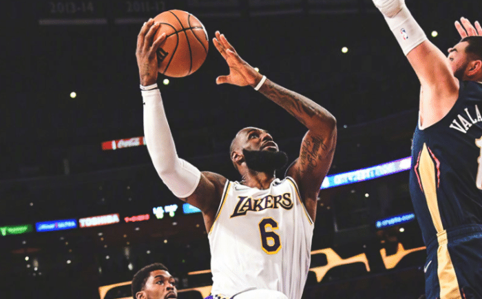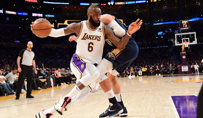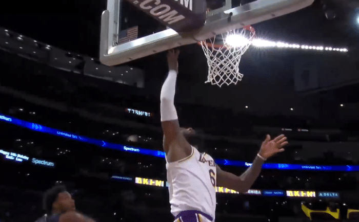 第四节,詹姆斯传球被海耶斯破坏出界,随后詹姆斯突破上篮打进。詹姆斯坚决突破到篮下,打成2+1。塔克击地球,詹姆斯扣篮得分,但无奈的是湖人限制不住鹈鹕的进攻,分差一直过大。詹姆斯跳投,琼斯防守犯规,他两罚全中。这样詹姆斯遗憾空砍,湖人主场输球。