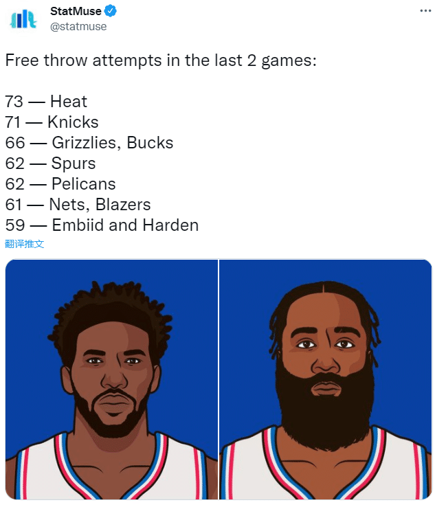 来源:JRS直播网02-28 11:59JRS直播网02月28日讯 ,据统计,过去两场比赛中,哈登和恩比德共计罚球出手59次,比联盟其他21支球队的最近两场罚球总出手数都要高。