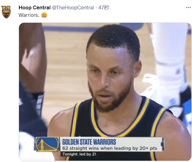 末节还剩10分钟勇士领先19分,之后被独行侠打出26-1超级攻势,最终独行侠拿下胜利;美媒晒出勇士连胜纪录遭终结,据统计当勇士领先20+时他们已经豪取62连胜,可今晚惨遭21分逆转后,勇士62连胜被终结,美媒更是晒出库里的沮丧表情,脸色铁青太难受。