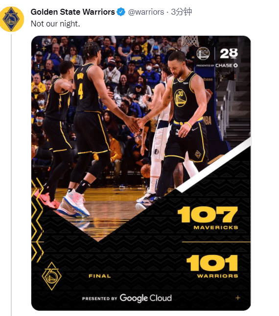 勇士扎心一战引热议,勇士官推第一时间晒出全场比分,发推写到:不是我们的夜晚。