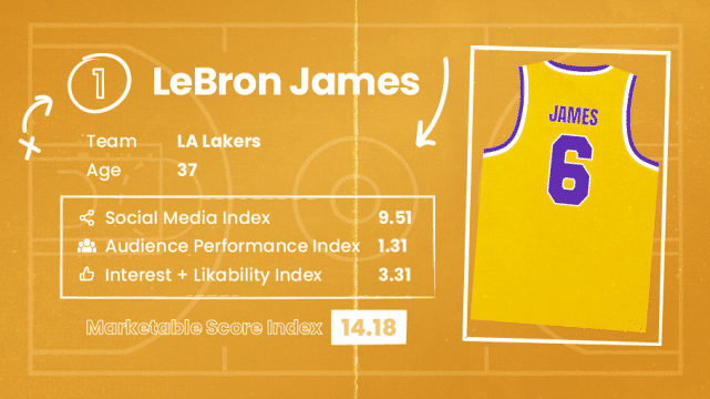美媒The Action Network公布了一项研究数据,他们根据20项不同的指标,为现役NBA球员打分,每项计为1分,这20项指标大致可以分成三类,一类是社交表现(评估他们的粉丝、参与度、年度社交增长,受众质量分),一类是收视率(评估球迷数量和经济因素),还有一类是总体喜爱度(评估每月的搜索量、在线的讨论和积极消极情绪)。满分是20分,詹姆斯以14.18分遥遥领先排名第一。